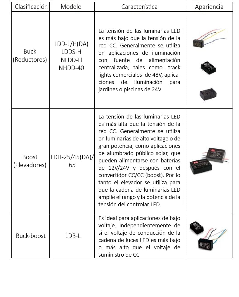Los controladores LED (CC-CC) se pueden clasificar como buck o step down (reductores de tensión), boost o step-up (elevadores de tensión) y buck-boost (reductor-elevador de tensión) según la estructura utilizada. La siguiente tabla muestra la clasificación y características de los productos distribuidos por Electrónica OLFER y fabricados por MEAN WELL.