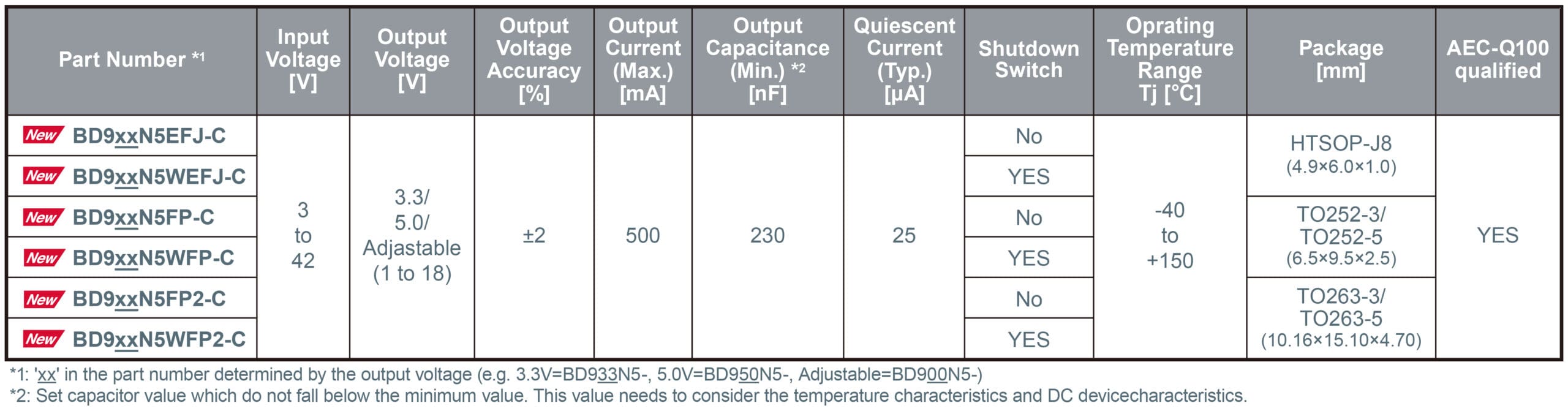 ROHM ha desarrollado la «serie BD9xxN5» de circuitos integrados de reguladores LDO con corriente de salida de 500 mA, que incorporan su tecnología patentada de control ultraestable «Nano Cap™». Esta serie incluye 18 productos diseñados para aplicaciones de fuentes de alimentación primarias de 12 V/24 V utilizadas en equipos para automoción, equipos industriales e infraestructuras de comunicación.