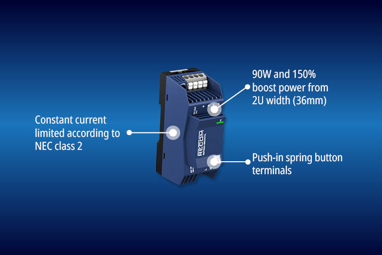 La fuente de alimentación para carril DIN de RECOM, de forma escalonada, ofrece un gran rendimiento y muchas funciones con una carcasa reducida.