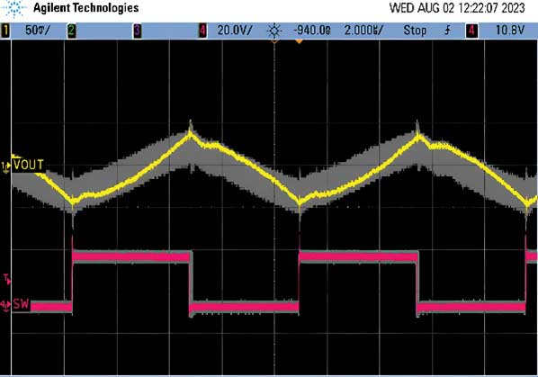 Los diseñadores a menudo prefieren bobinas más pequeñas para ahorrar espacio, ya que las bobinas de menor valor suelen tener dimensiones físicas más pequeñas debido a un menor número de espiras. Sin embargo, si el inductor es demasiado pequeño, la corriente de rizado será grande y obligará al convertidor a entrar en DCM, lo cual no es deseable para el convertidor SMPS porque el dispositivo será menos eficiente y mostrará un peor rendimiento de interferencia electromagnética (EMI). Este rendimiento degradado de EMI se puede ver en presencia de oscilaciones (ringing) en el nodo de conmutación, causados por parásitos, así como por el circuito LC (creando un circuito resonante), que se puede ver en la Figura 10. Este timbre se trasladará a la tensión de salida, lo que provocará un rizado mayor y más picos de tensión, como se ve en la Figura 11. Además, la fuente de alimentación ya no estaría en modo de conducción continua (CCM) y las fórmulas de salida para un convertidor SMPS ya no aplican.
