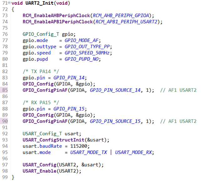 El código inferior muestra la activación del USART y el puerto GPIO A. Aquí llamamos a las funciones RCM para permitir que esos dos periféricos se conecten al reloj del sistema.