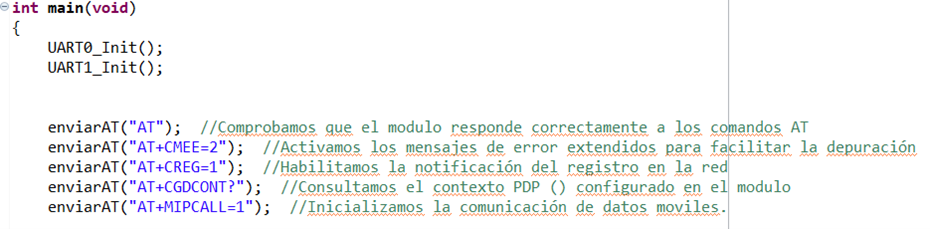 La comunicación entre el microcontrolador y el módulo LE270 se realiza mediante interfaz UART, haciendo uso de comandos AT. Para esta comunicación ha sido necesario crear una función auxiliar denominada enviarAT() encargada de enviar cadenas de texto que contienen los comandos AT al módem Fibocom a través del puerto UART2, dedicado exclusivamente a la comunicación con el módulo.