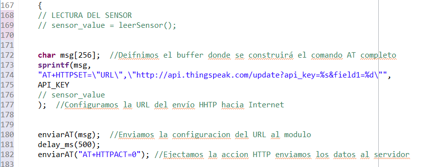 Tras la lectura del sensor, el valor medido ya puede ser enviado mediante el módulo de comunicaciones hacia Internet. En este ejemplo se envían a la plataforma ThingSpeak, donde los datos pueden ser visualizados y analizados.