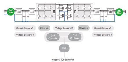 La plataforma de potencia de CINERGIA se basa en un convertidor regenerativo back-to-back de IGBTs. El filtro activo trifásico de entrada permite un consumo, o inyección, de corriente cumpliendo los más estrictos requisitos de calidad con una THDi inferior al 3% y un factor de potencia próximo a la unidad. Para aquellas aplicaciones que requieren un control de la energía reactiva, por ejemplo, para dar soporte a la red, los equipos admiten la selección del nivel de reactiva deseado. El convertidor de salida, tres ramas de IGBTs, se configura y se controla de forma distinta según el modelo: fuente de tensión 4Q de AC (monofásica o trifásica), fuente de corriente 4Q AC (monofásica o trifásica) o buck/ boost bidireccional en DC. La robustez de esta plataforma de control, desarrollada para trabajar 24/7, hace posible su uso en las aplicaciones más exigentes.