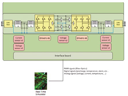 - Open Converter: en estas aplicaciones el sistema de control en tiempo real controla el convertidor a bajo nivel, mandando consignas PWM y recibiendo directamente las lecturas analógicas de tensión y corriente del convertidor. El sistema de control, por tanto, se realiza en el RTCS y no en la plataforma de control de CINERGIA que es sustituida por una tarjeta de adaptación de señales y protección a nivel hardware.
