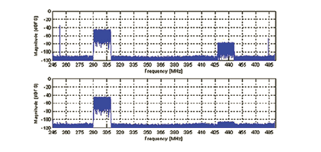 Esta configuración proporciona un rango dinámico muy elevado gracias al convertidor D/A[4] y al amplificador digital de ganancia variable (DVGA) [5] de bajo ruido y alta linealidad. Se utiliza una TI ADC disponible comercialmente de 14bit/500Msps que integra errores de ganancia y sincronización ajustables de alta resolución. Los datos en bruto del convertidor A/D se capturaron con una FPGA y se procesaron con un algoritmo de calibración de IDT utilizando software Matlab®. Los errores de ganancia y sincronización del la TI ADC se han establecido aproximadamente en 0,5dB y 5ps, respectivamente, para simular la situación en el peor caso posible. La Figura 4 muestra los espectros de potencia de los datos antes y después de la calibración. La imagen de portadora de LTE, en -80dBFS antes de la calibración, se ha reducido en unos 30dB hasta -110dBFS tras la calibración.