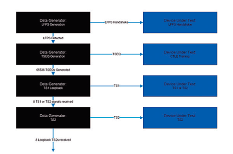 Para la preparación del bucle, el generador de datos inicia cada prueba configurando el puerto SS para que entre en el bucle (Figura 1). En primer lugar el generador de datos transmite señales periódicas de baja frecuencia (low frequency periodic signals, LFPS) para imitar las comunicaciones SS. El DUT responde entonces con un reconocimiento de la señal LFPS. El generador de datos transmite la señal de secuencia de preparación (training sequence, TSEQ) aplicando el ruido adecuado. Esto permite que el DUT forme la señal TSEQ y adapte los filtros internos para lograr las mejores prestaciones.