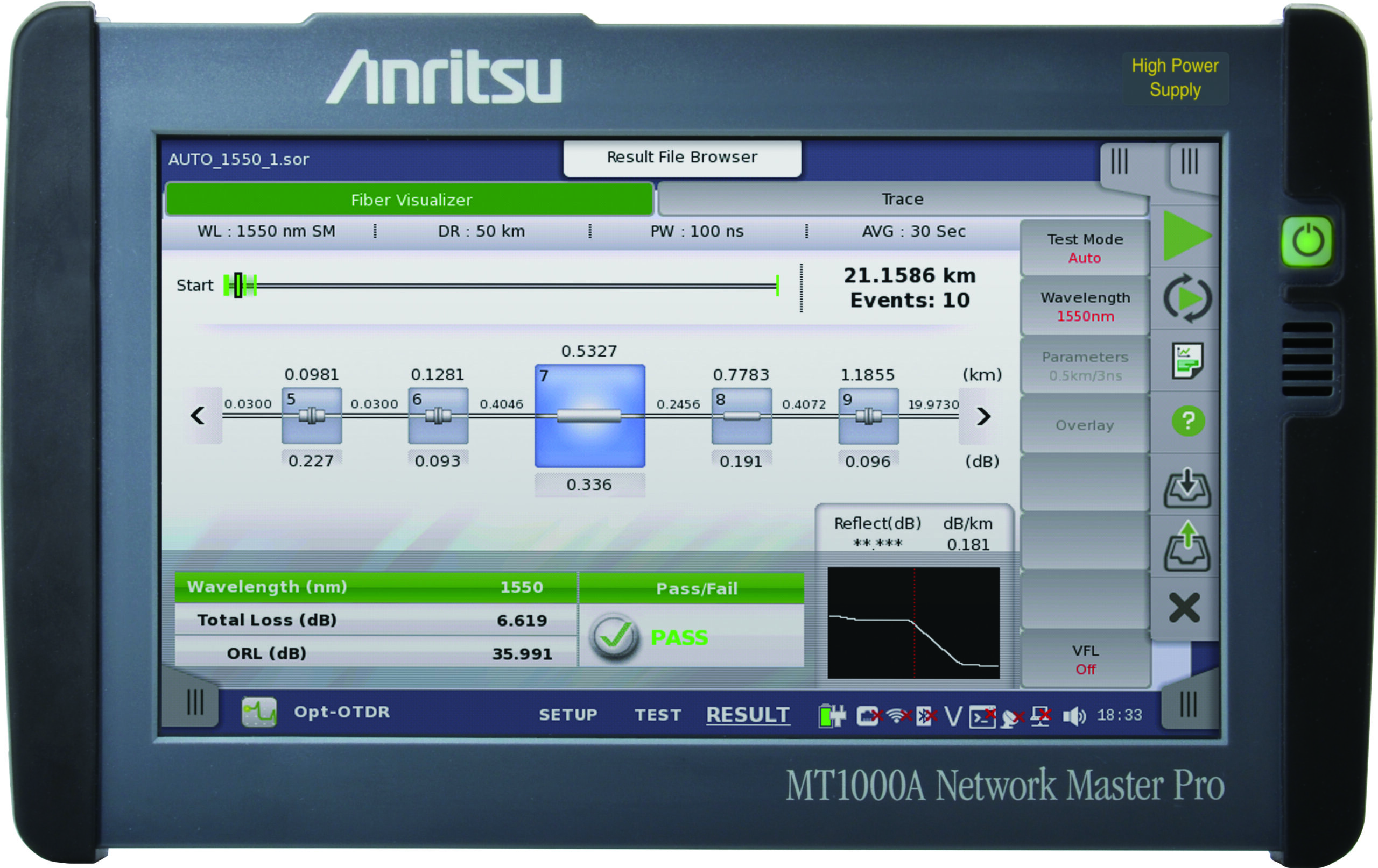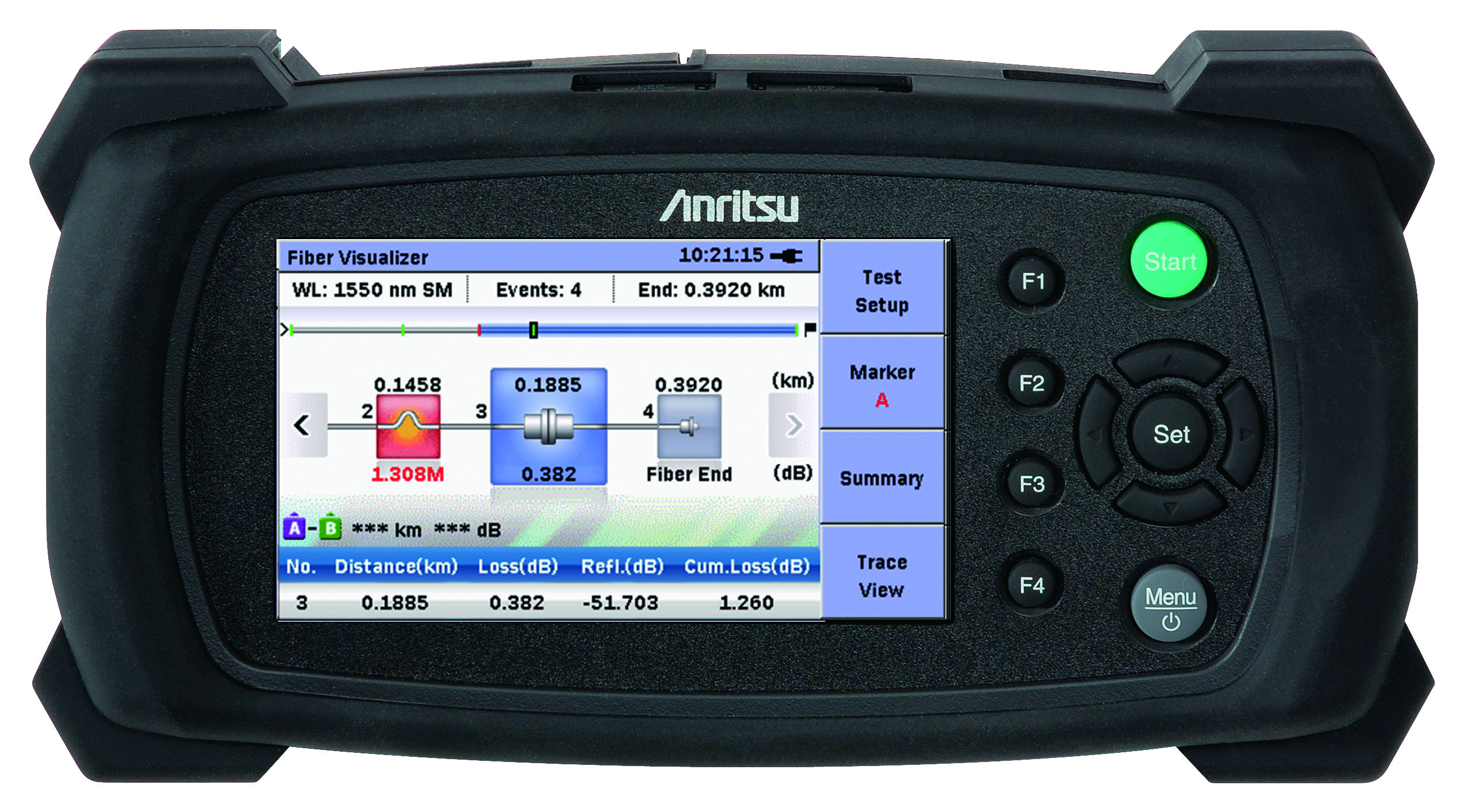 Los escasos conocimientos sobre comprobadores y procedimientos complejos, especialmente entre los ingenieros con menos experiencia, reduce la eficiencia de las operaciones. Para solucionarlo, Anritsu suministra la función Fiber Visualizer, que muestra iconos fácilmente comprensibles de los eventos: cada uno representa un determinado punto como el extremo de la fibra óptica, el divisor de PON, la curva de la fibra, el conector óptico o el punto de fusión. Toma decisiones pasa/falla de forma automática en función de los valores de umbral preestablecidos. Para reducir aún más los errores en las operaciones e incrementar la eficiencia de funcionamiento, el MT1000A y el MT1040A ofrecen una función de prueba automática que va guiando al usuario.