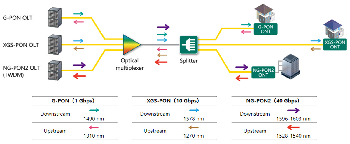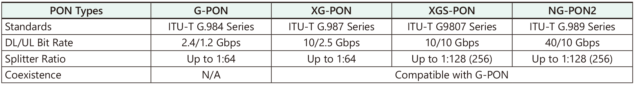La ITU-T desarrolló entre 2003 y 2004 el estándar G-PON, que contempla velocidades de 2,4 Gbps en el enlace descendente (DL) y de 1,2 Gbps en el ascendente (UL). Posteriormente llegó el estándar XG-PON con 10 Gbps para el DL y 2,5 Gbps para el UL. En 2016 se creó XGS PON, que alcanza 10 Gbps para el tráfico tanto de DL como de UL. Para adaptarse a la incesante demanda de comunicaciones de datos se desarrolló el estándar NG-PON2, que admite 40 Gbps en el DL y 10 Gbps en el UL al combinar multiplexación por división de tiempo (TDM) y multiplexación por división de forma de onda (WDM).