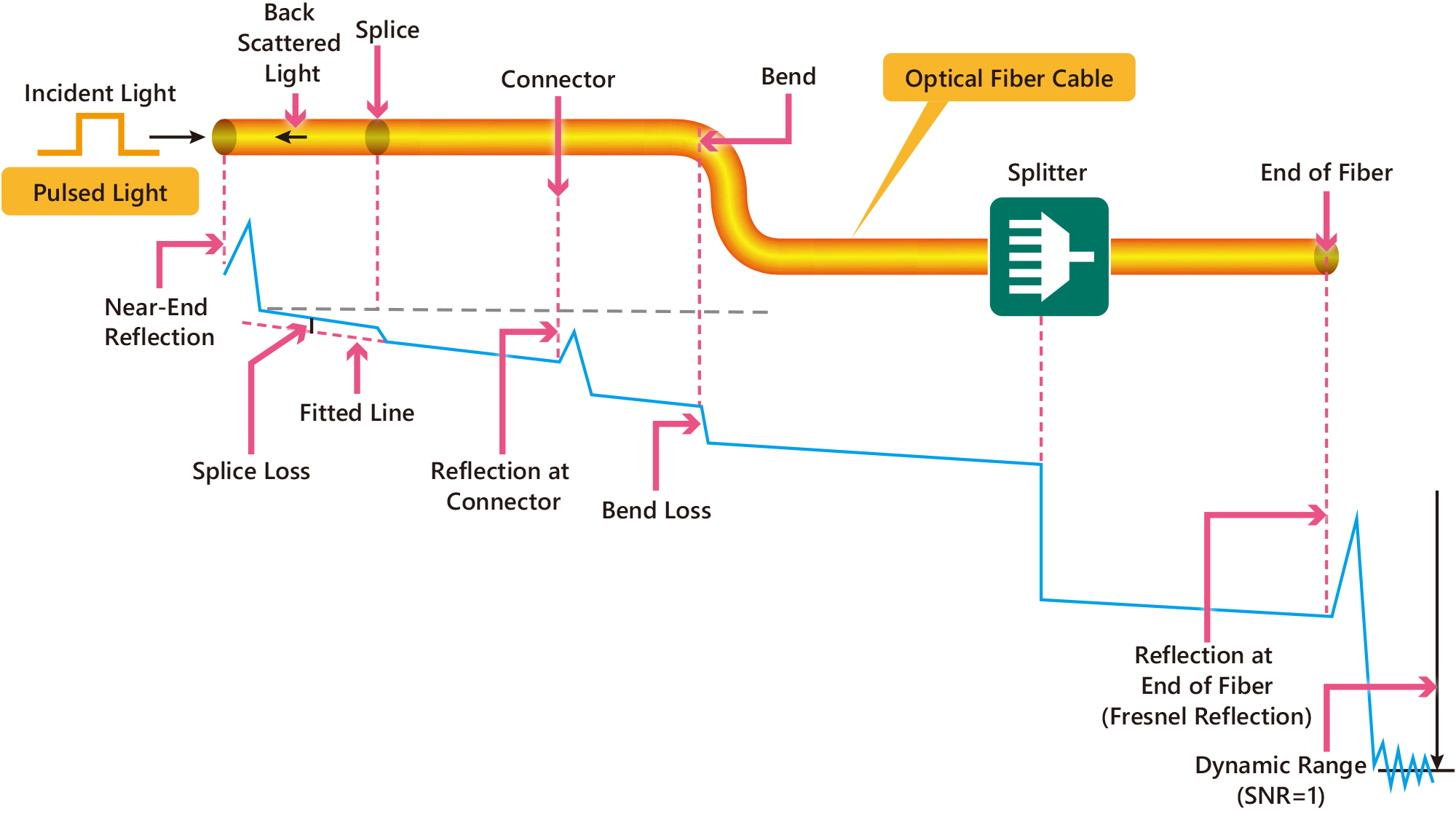 En la prueba de fibra óptica se usa un OTDR para detectar eventos como pérdidas de potencia, reflejos o puntos de fallo a lo largo de una fibra. Cuando se conecta a un extremo de la fibra óptica, el OTDR introduce señales de pulsos ópticos en la fibra y a continuación mide y analiza la luz dispersada que vuelve de la fibra óptica, así como la luz reflejada por malas conexiones o cables rotos. El OTDR puede detectar y evaluar varias características, como la distancia de la fibra óptica, el conector, el empalme, el divisor óptico, las pérdidas en la fusión y los puntos de conexión, las pérdidas de transmisión, las pérdidas por curvado y las pérdidas totales de retorno. La Figura 2 muestra las medidas del OTDR a lo largo de una fibra óptica.