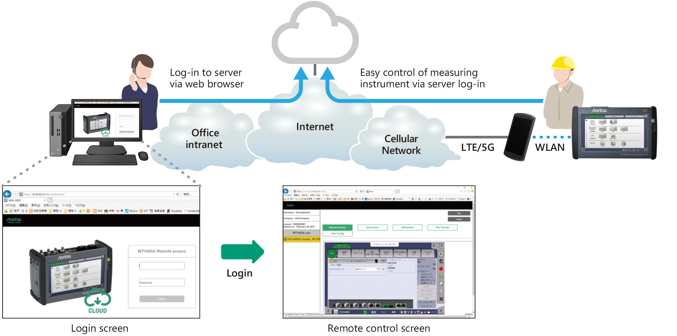 Es posible que en algunos casos el ingeniero de campo se tope con problemas demasiado complejos como para resolverlos de manera independiente. Para ayudar al ingeniero o administrador experimentado de forma remota, el SORA (Site Over Remote Access) MX109020A basado en la nube conecta el MT1000A o el MT1040A a una red móvil a través de una LAN inalámbrica y luego a través de la nube. SORA también puede subir informes con resultados de las medidas para almacenarlos en la nube. La Figura 5 describe el uso de SORA.