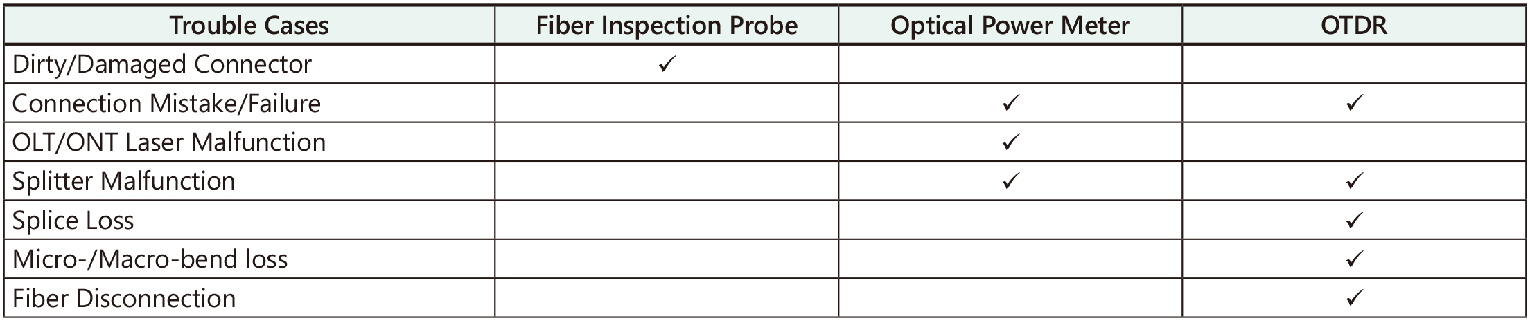 Los problemas en las instalaciones PON se pueden evitar con una comprobación exhaustiva. La Tabla 2 muestra algunos ejemplos de los principales problemas que caracterizan a una PON y los equipos de prueba que se pueden utilizar para resolverlos: sonda de inspección de fibra, medidor de potencia óptica y OTDR.