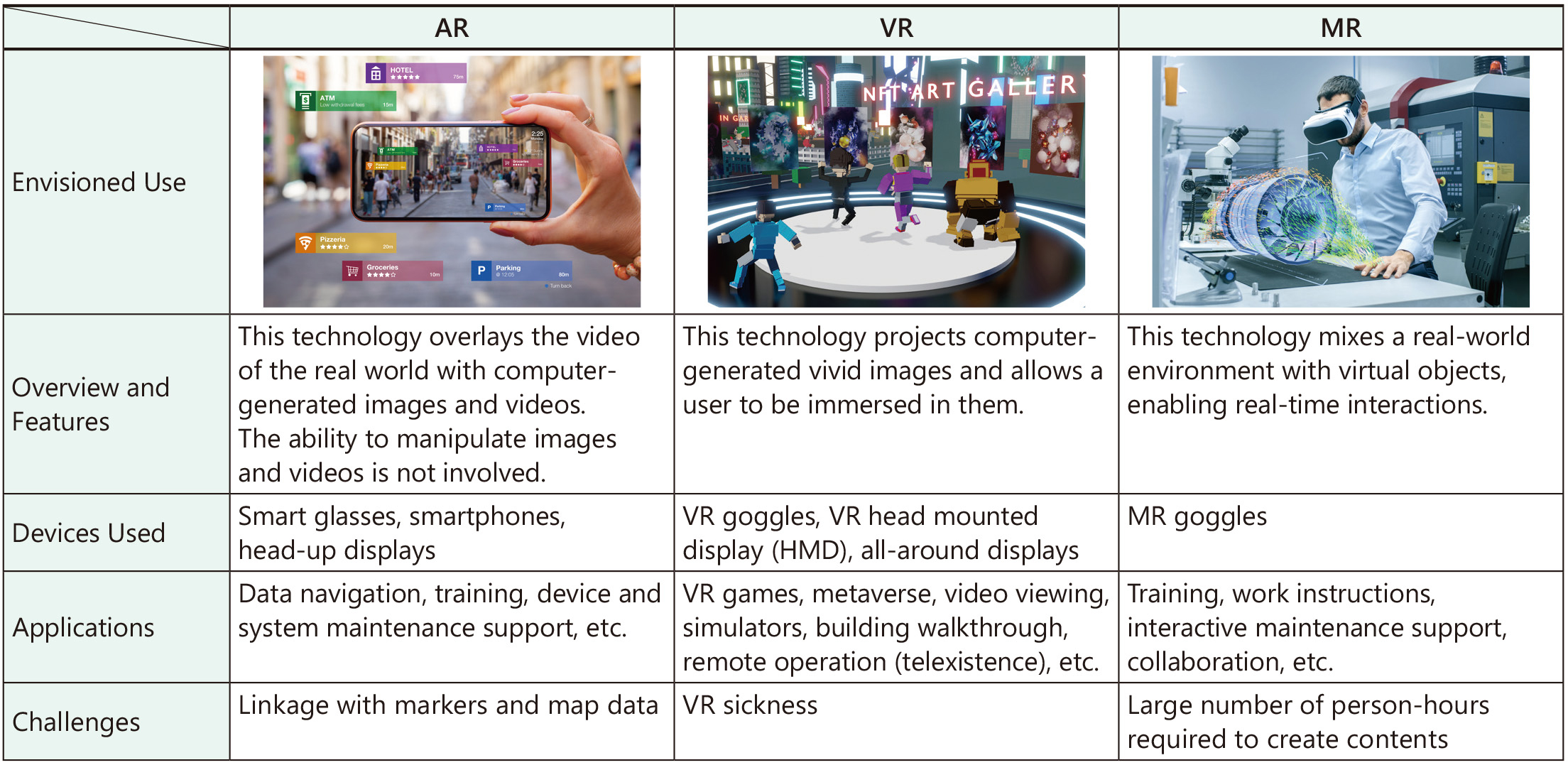 Figura 1: Principales características de AR, VR y MR.