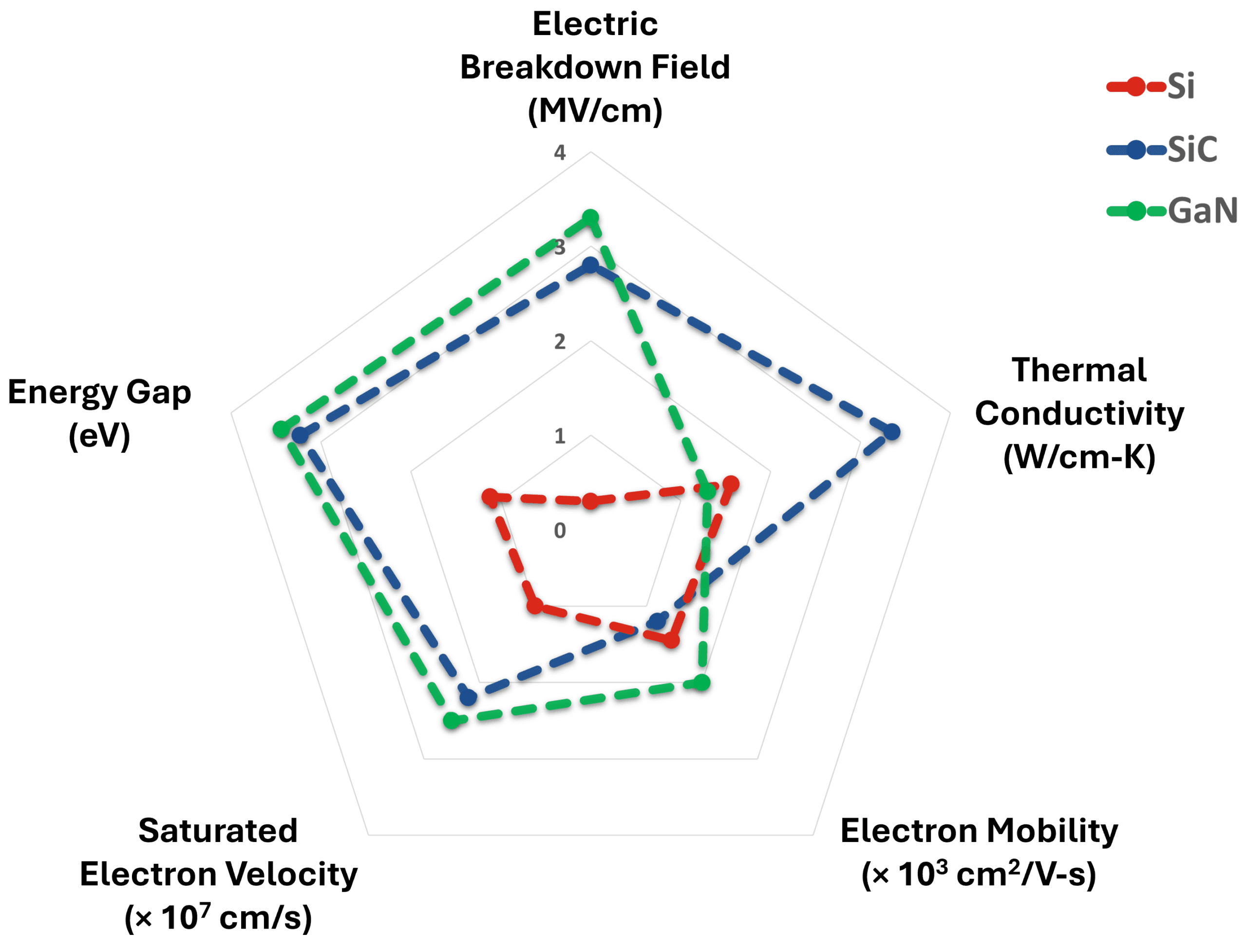 A la hora de seleccionar el material semiconductor óptimo, se deben tener en cuenta varias características. El objetivo es obtener un interruptor con una resistencia en estado activo mínima, una corriente de fuga en estado inactivo mínima, una alta capacidad de bloqueo de tensión y una alta potencia. La figura 1 muestra las características de los materiales semiconductores para el silicio (Si), el carburo de silicio (SiC) y el nitruro de galio (GaN). El campo de ruptura eléctrica del SiC y el GaN es aproximadamente diez veces mayor que el del silicio. Esto permite diseñar dispositivos con una región de deriva que es una décima parte del grosor de un dispositivo de silicio de potencia equivalente, ya que su grosor es inversamente proporcional al campo de ruptura eléctrica. Además, la resistencia de la región de deriva (drift) es inversamente proporcional al cubo del campo de ruptura (breakdown). Esto da como resultado una resistencia de la región de deriva casi 1000 veces menor. En una aplicación de conmutación de estado sólido, donde todas las pérdidas son pérdidas por conducción, el alto campo de ruptura eléctrica es una ventaja significativa. Esta disminución de la resistencia también elimina las preocupaciones relacionadas con los problemas de enclavamiento (latch-up) dinámico, en los que los transitorios de alto dV/dt pueden activar el transistor NPN parásito o el tiristor en los MOSFET de potencia de silicio y los IGBT, respectivamente.