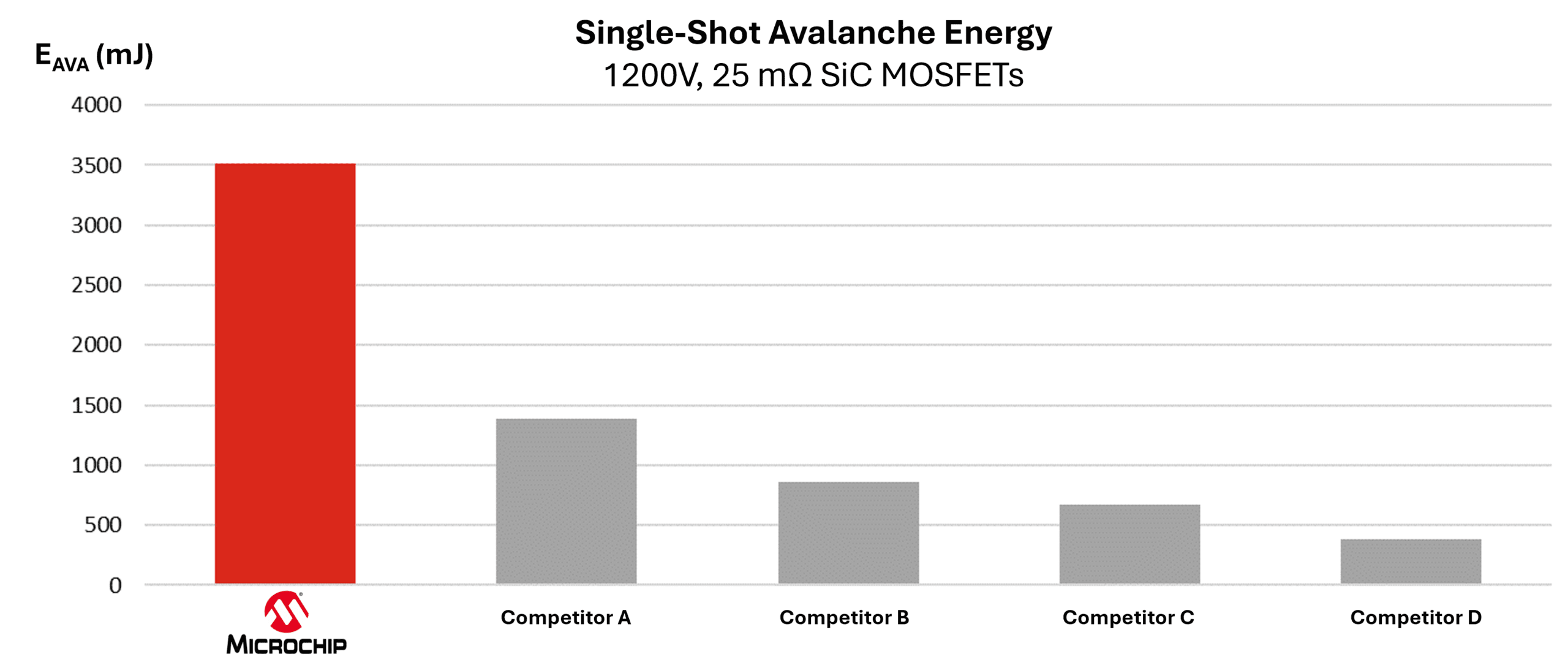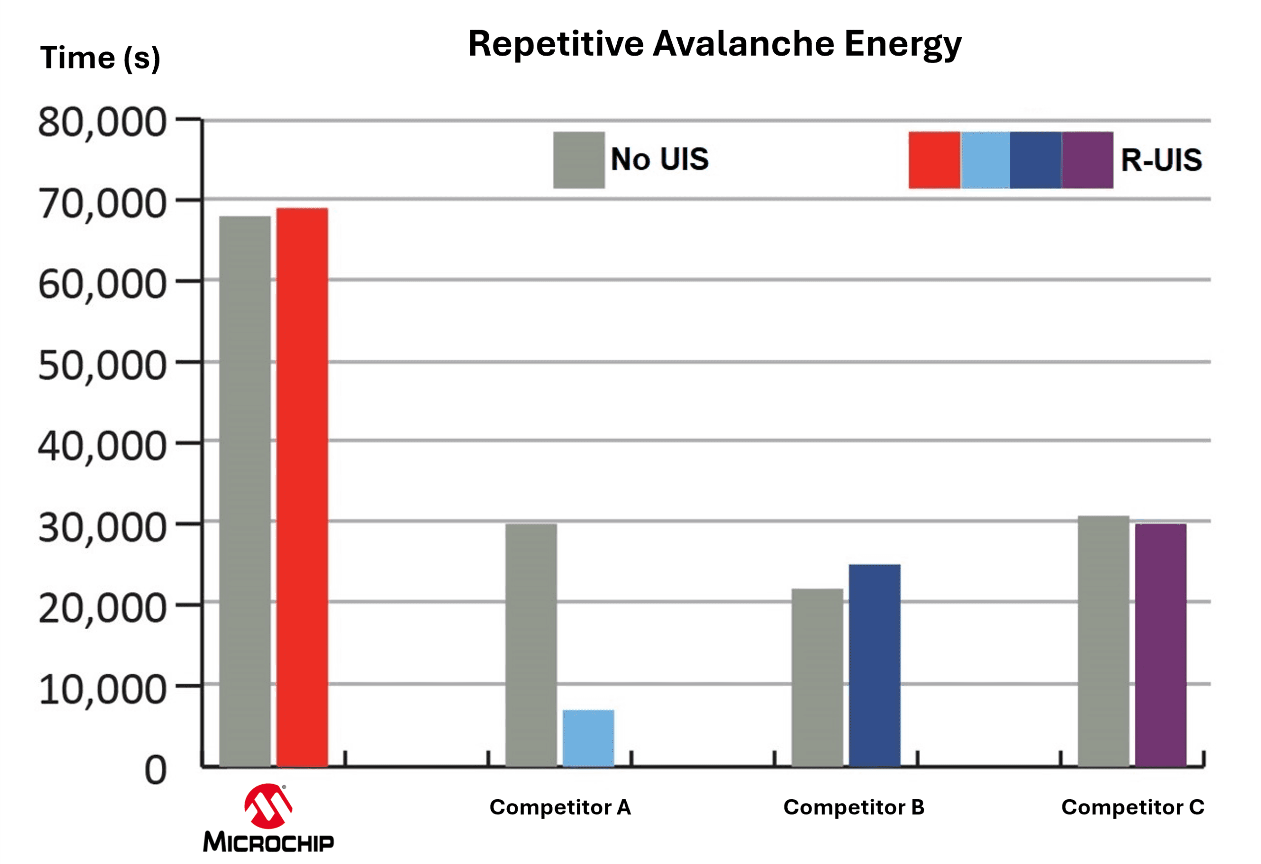 En los dispositivos de potencia de silicio, una interrupción rápida de una corriente alta introduce el riesgo de activar el NPN o tiristor parásito, lo que da lugar a un bloqueo incontrolable y, finalmente, a un fallo. En los dispositivos de SiC, una desconexión muy rápida puede provocar una avería por avalancha de baja energía en cada chip al apagarse, hasta que el amortiguador o la sujeción absorben la alta energía. Los MOSFET mSiC de Microchip están diseñados y probados para soportar la conmutación inductiva sin sujeción (UIS – Unclamped Inductive Switching), lo que proporciona un margen de seguridad adicional cuando el amortiguador o la sujeción comienzan a degradarse. La figura 3 muestra el rendimiento UIS de un solo disparo y repetitivo en comparación con otros dispositivos de SiC del mercado.