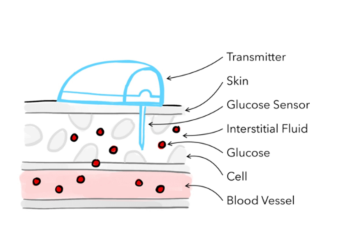 Figura 1. Imagen de DiabetesWise.org. La imagen describe las capas de la piel sobre los vasos sanguíneos y muestra cómo la información fiable sobre la glucosa reside en el líquido intersticial, más allá de la sangre.