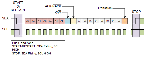 El arbitraje es el proceso consistente en determinar a qué dispositivo se le permite comunicarse con el controlador. Imaginemos, por ejemplo, que dos dispositivos A y B se quieren comunicar con el controlador activo simultáneamente. El dispositivo A tiene una dirección de 7’h10, mientras que el dispositivo B tiene una dirección de 7’h14. Cuando se genera una interrupción en banda, ambos dispositivos intentarán transmitir su dirección al controlador activo. En este estado del bus, la línea de datos está en drenador abierto. Durante la comunicación en drenador abierto, la línea vuelve de manera pasiva a “1” por medio de una resistencia de polarización y se puede llevar activamente a “0”. Esto evita que se produzca un cortocircuito cuando ambos dispositivos transmiten 1 y 0 al mismo tiempo.