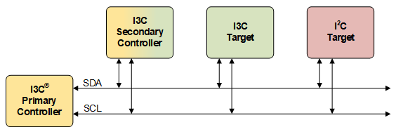I2C admite buses multicontrolador, de manera que varios dispositivos funcionan como controladores pero solo uno se comunica activamente en un momento determinado. Sin embargo, en I3C solo un dispositivo puede ser el controlador activo; es posible que otros dispositivos soliciten convertirse en el controlador del activo en el bus. Este dispositivo se denomina controlador secundario. Cuando un controlador secundario no actúa como controlador activo, funciona un dispositivo de destino de I3C.
