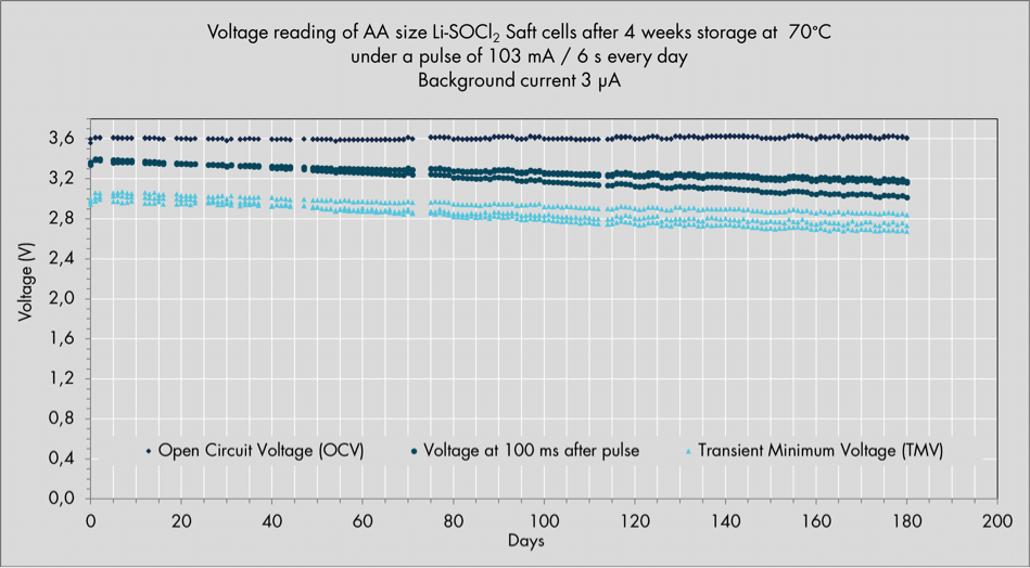 Los resultados que puede observar en los gráficos siguientes, provienen de más de un año de pruebas. Las lecturas de tensión de las celdas Saft después de un período de almacenamiento de un mes a 70 °C, están por encima de 2,4 V, mientras que los competidores muestran lecturas de tensión inferiores a 1 V, no compatibles con una respuesta de tensión esperada para alimentar una solución de IoT durante varios años.