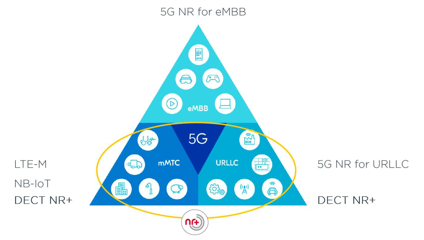 La Unión Internacional de Telecomunicaciones (UIT) y el Instituto Europeo de Normas de Telecomunicaciones (ETSI) han ratificado recientemente el estándar DECT-2020 New Radio (NR)+ como parte del conjunto de normativas 5G. El DECT Forum, los fundadores del estándar DECT para teléfonos inalámbricos, han desarrollado el DECT NR+,sin embargo, no se origina en el estándar inalámbrico. El DECT NR+ cumple con las necesidades de instalaciones IdC e IIdC grandes, de baja latencia, ultrafiables y a gran escala, como las ciudades inteligentes, los medidores inteligentes, la Industria 4.0 y la transmisión de audio de alta calidad (por ejemplo, en estadios o recintos grandes para conferencias).