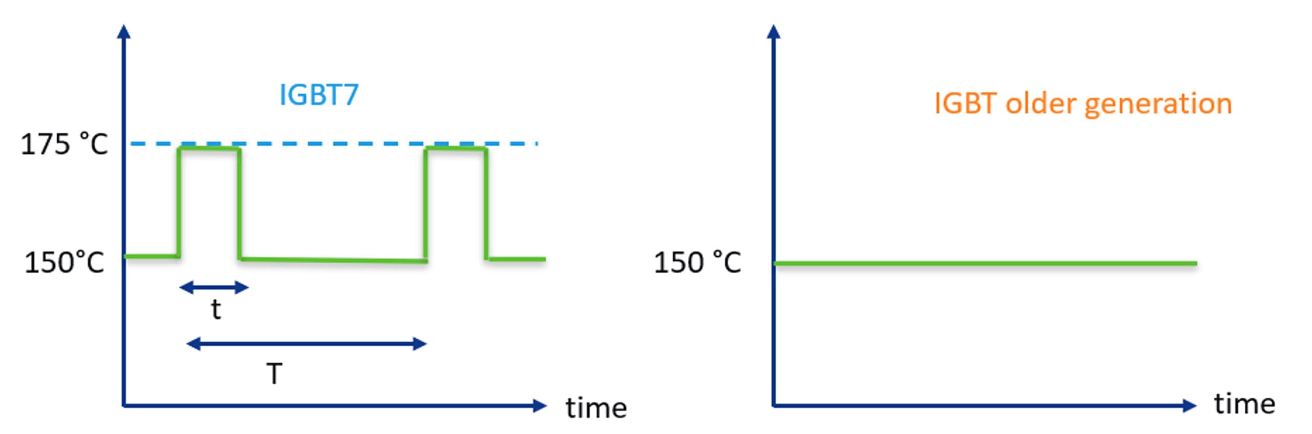 Figura 1. Comparación de la temperatura máxima de funcionamiento en la unión entre el IGBT7 y las generaciones anteriores de IGBT.