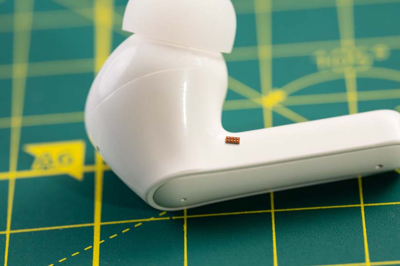 Figura 5. Comparación de tamaño entre un MSPM0C1104 y un aurícular inalámbrico.