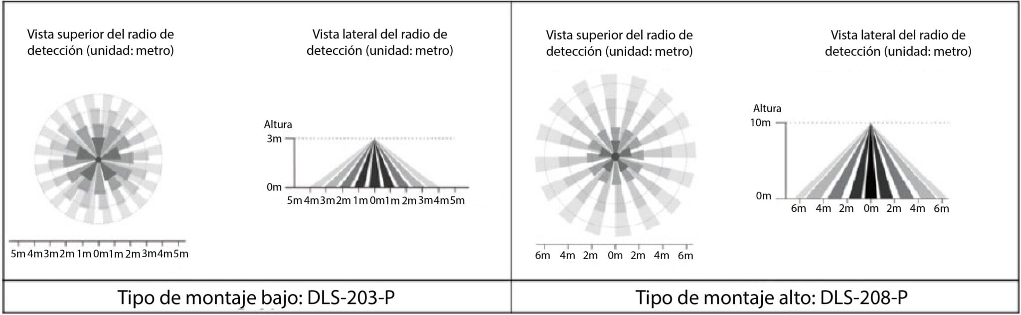 - DLS-203-P: Admite una altura de instalación de 3 metros con un radio de detección de 3 a 4 metros.