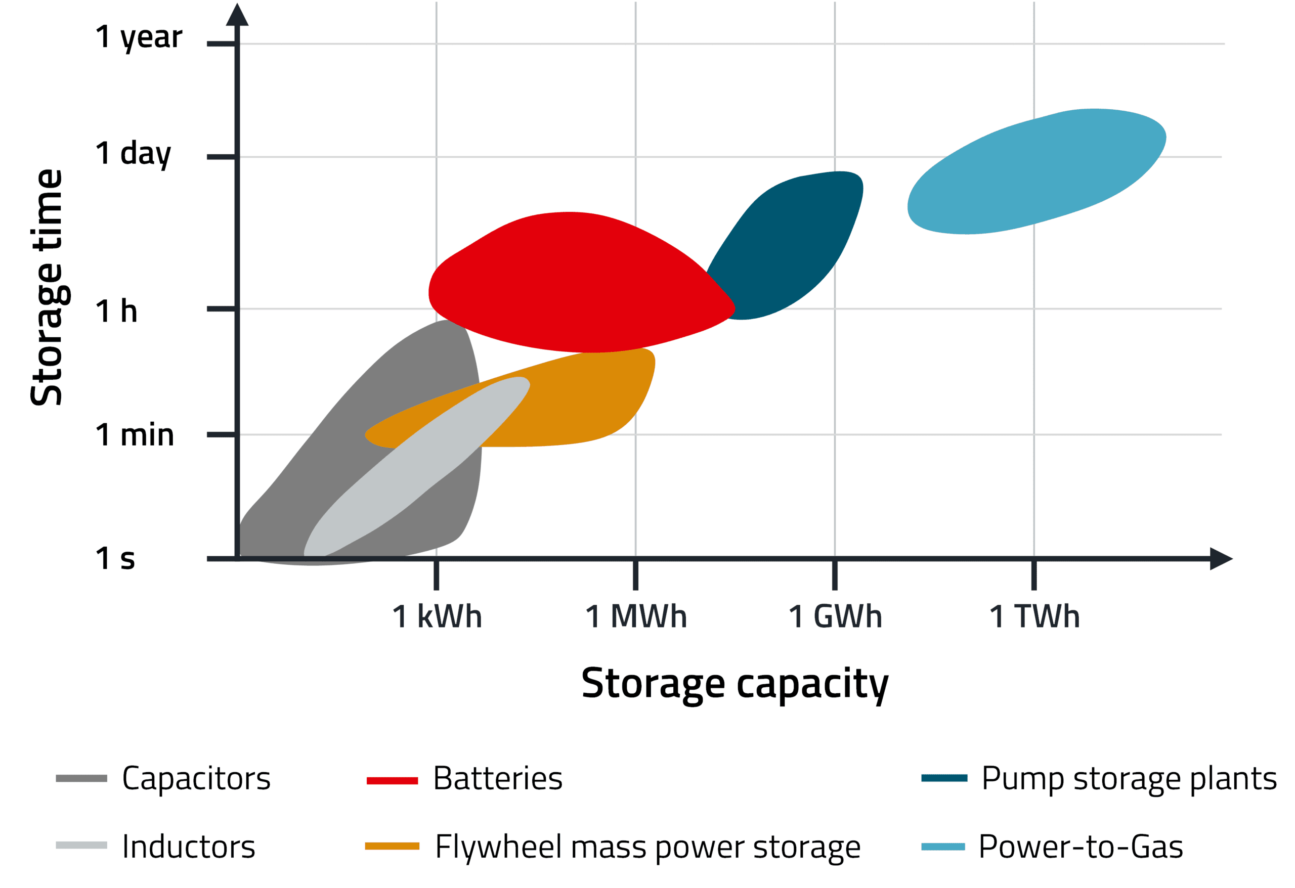 Dos pilares clave de la transición energética son el uso generalizado de sistemas fotovoltaicos y de energía eólica. El viento y la energía solar son, en principio, recursos inagotables y gratuitos, por lo que dichas fuentes de energía pueden utilizarse de forma respetuosa con el  medio ambiente para producir electricidad. Lamentablemente, existe un pequeño problema: el viento y el sol no están siempre disponibles y su energía sujeta a una alta variabilidad. Para evitar interrupciones en el suministro eléctrico durante periodos prolongados sin viento ni sol, es necesario contar con capacidad de generación eléctrica o sistemas de almacenamiento energético que compensen temporalmente la el déficit de energía en la red. Un estudio práctico  de la Agencia Federal Alemana de Medio Ambiente, así como un artículo en el portal «energie-experten.org» ofrecen una visión general de los distintos métodos de almacenamiento de energía eléctrica.  La figura 1 muestra los métodos más comunes para almacenar energía eléctrica en términos de duración y capacidad de almacenamiento.