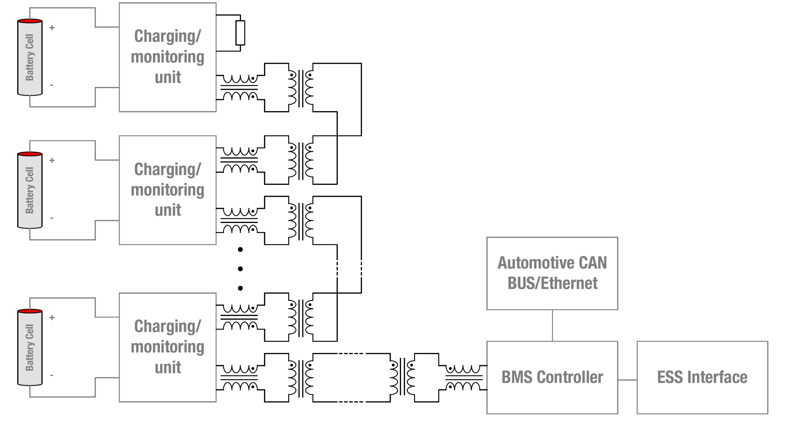Las celdas individuales de un paquete de acumuladores están conectadas en serie, al igual que los controladores BMS posteriores. Pueden producirse diferencias de tensión e interferencias electromagnéticas entre los componentes o placas de circuitos impresos conectados en serie. Se pueden utilizar transformadores para aislar los componentes entre el lado de alta tensión y el de baja tensión y suprimir así las interferencias EMI. Esto es sumamente importante para garantizar que no se transmiten tensiones peligrosas a las partes que se pueden tocar ni al BMS. Los transformadores WE-BMS cumplen esta función y crean el aislamiento del BMS y la supresión de interferencias EMI para un funcionamiento seguro y fiable. La figura 4 muestra el uso de transformadores WE-BMS en un sistema de gestión de baterías.