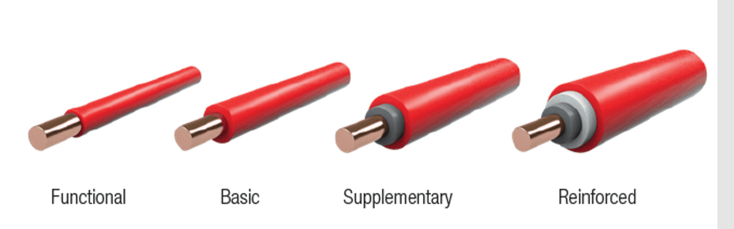 El aislamiento funcional (functional) es el nivel básico necesario para la funcionalidad. Sin embargo, este tipo de aislamiento no evita las descargas eléctricas. El aislamiento básico (basic) proporciona al usuario una protección sencilla contra las descargas eléctricas. El aislamiento suplementario (supplementary) va más allá del aislamiento básico y ofrece una protección adicional. El aislamiento reforzado (reinforced) proporciona una capa adicional que funciona de forma similar al aislamiento suplementario. Aunque falle el aislamiento básico, el aislamiento adicional sigue siendo eficaz y protege al usuario.