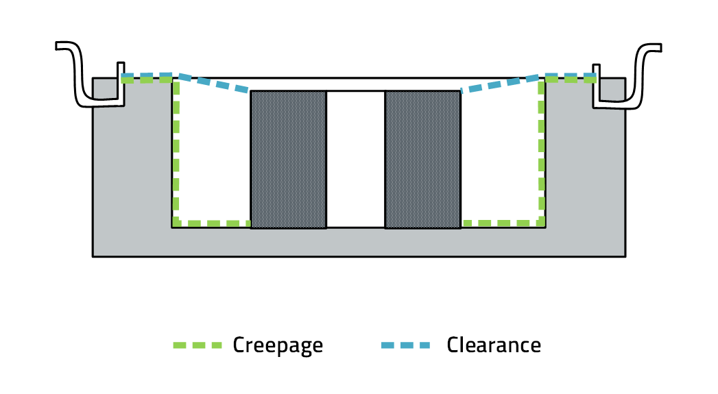 La distancia de aislamiento (clearance distance) es la distancia más corta entre dos partes conductoras (conductors). Es importante asegurar distancias de aislamiento suficientes para proteger a las personas y a los equipos de los efectos de las tensiones eléctricas de trabajo. La distancia de aislamiento necesaria se calcula determinando la categoría de sobretensión, el grado de contaminación y la tensión de trabajo. A continuación, puede determinarse la distancia de aislamiento mínima utilizando la tabla 14 de la norma anterior.